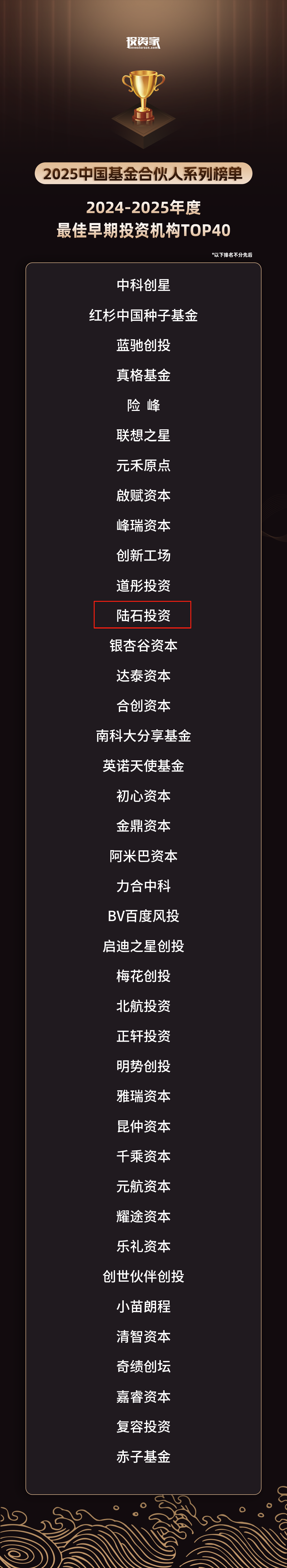陆石•喜报 | 陆石投资荣获投资家网2024-2025年度「最佳早期投资机构TOP40」、「最佳早期投资人TOP25」奖项