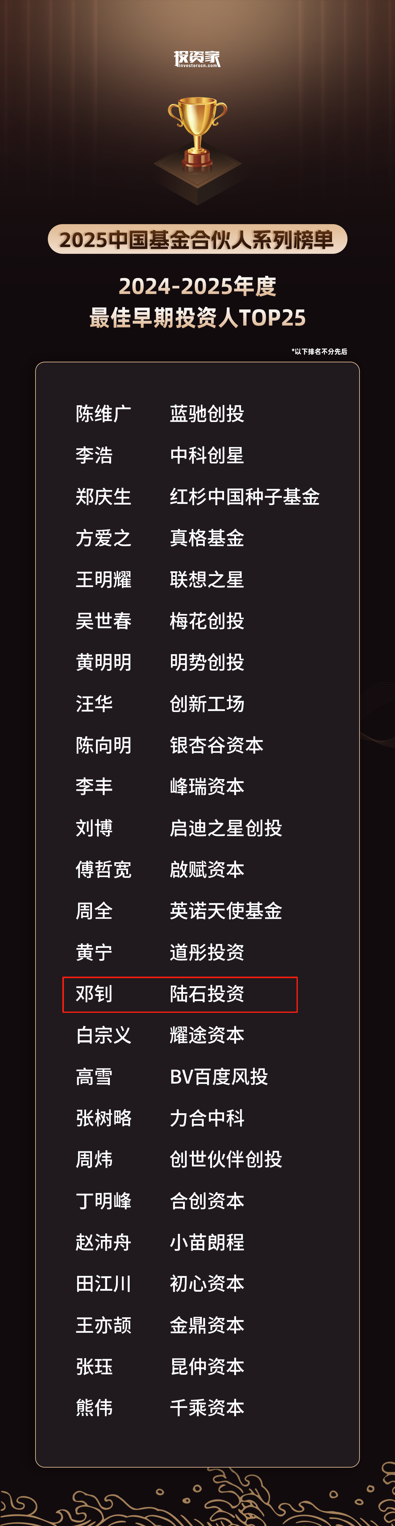 近日,投资家网发布“投资家网·2024-2025年度基金合伙人榜单”,表彰过去一年在股权投资行业持续付出、取得杰出成绩的投资机构与个人,共同见证股权投资行业的荣耀时刻。在此次评选中,陆石投资荣获“2024-2025年度最佳早期投资机构TOP40”奖项,陆石投资创始合伙人、董事长邓钊先生荣获“2024-2025年度最佳早期投资人TOP25”奖项。